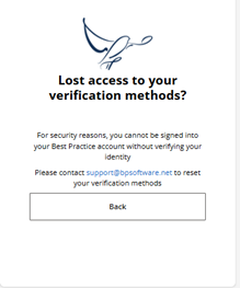 Contact Best Practice Support if you are unable to use your MFA identity verification methods or access your Best Practice ID user account.