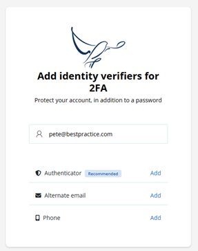 Best Practice Software requires you to have a minimum of two identity verification methods so that you can recover your account if you lose access to one.