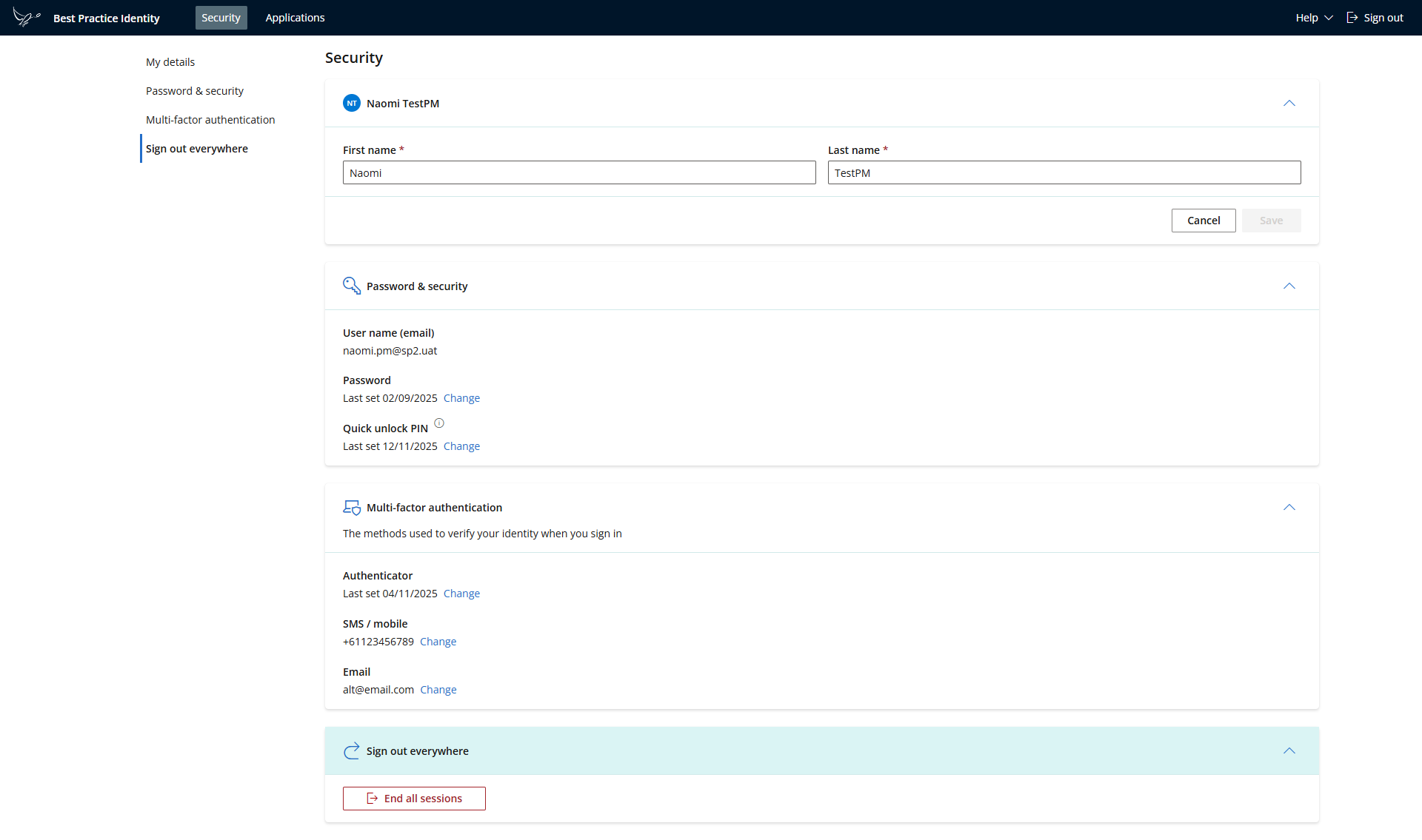 Your user account is where you can update your security settings or see which applications and practice sites your Best Practice ID is linked to.