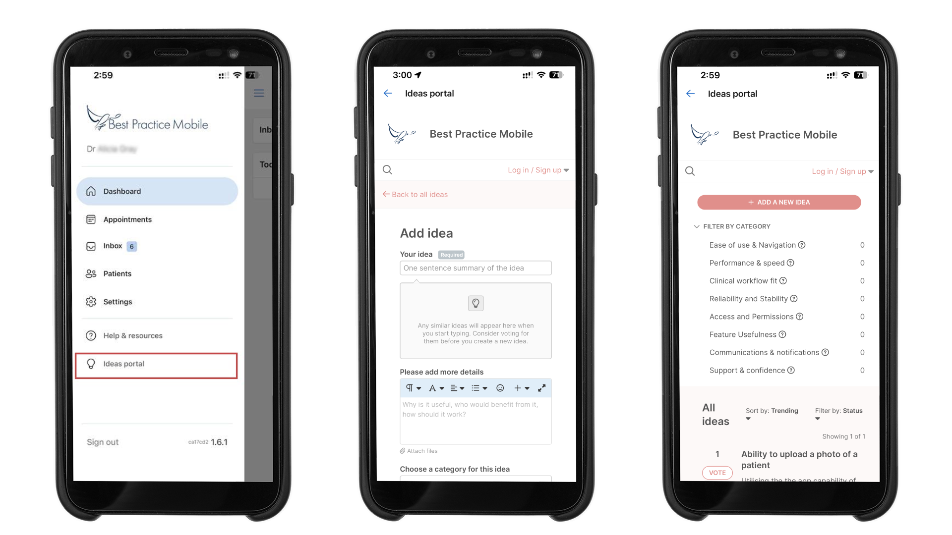 The Ideas portal is a place for you to share your suggestions and ideas for features with us to help shape the future of Best Practice Mobile.