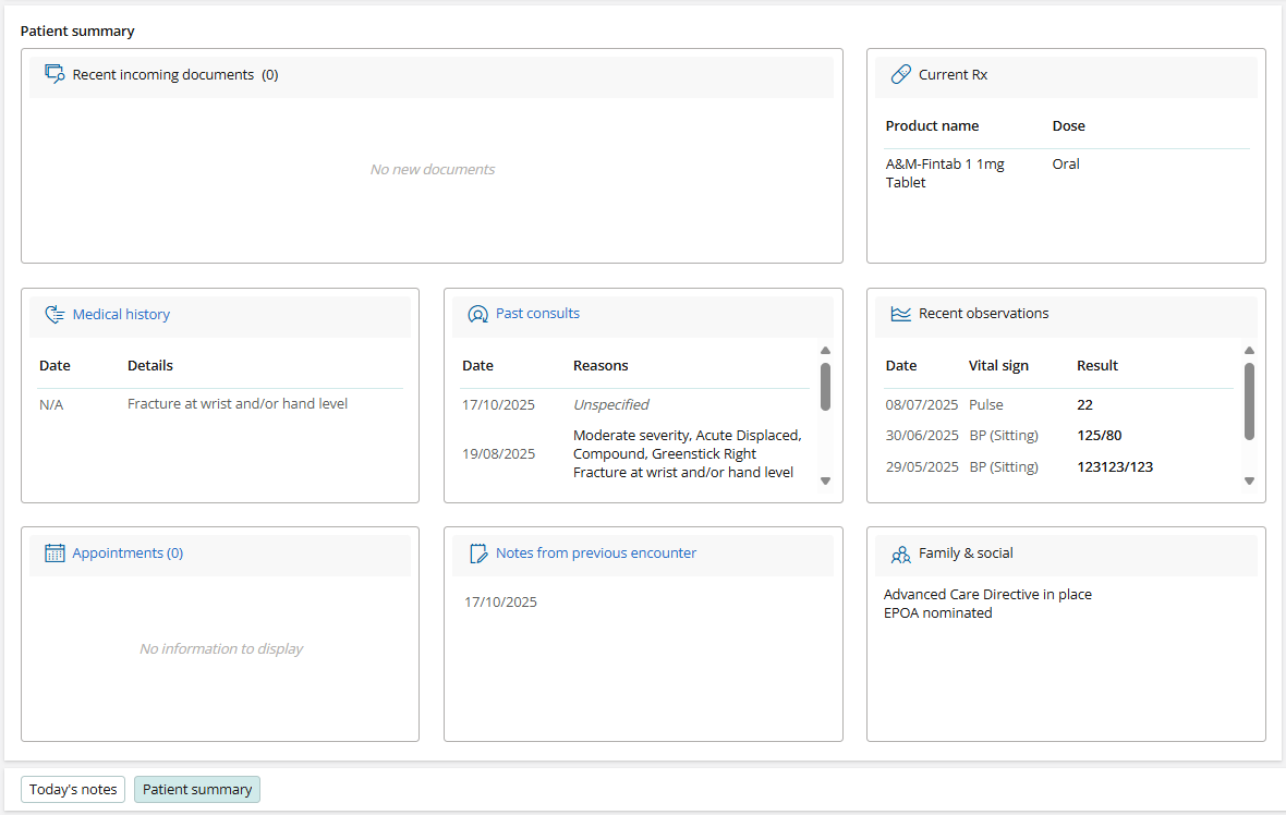 The Patient summary tab will display an overview of: