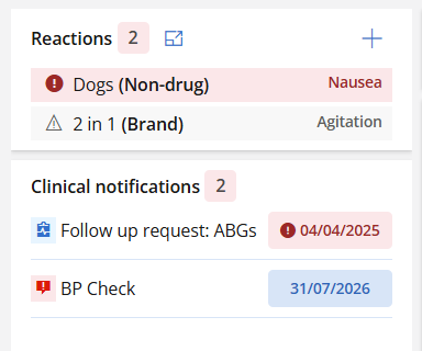 In the left-hand panel of the clinical record, you will see the Reactions and Clinical notifications.