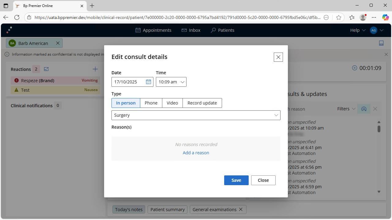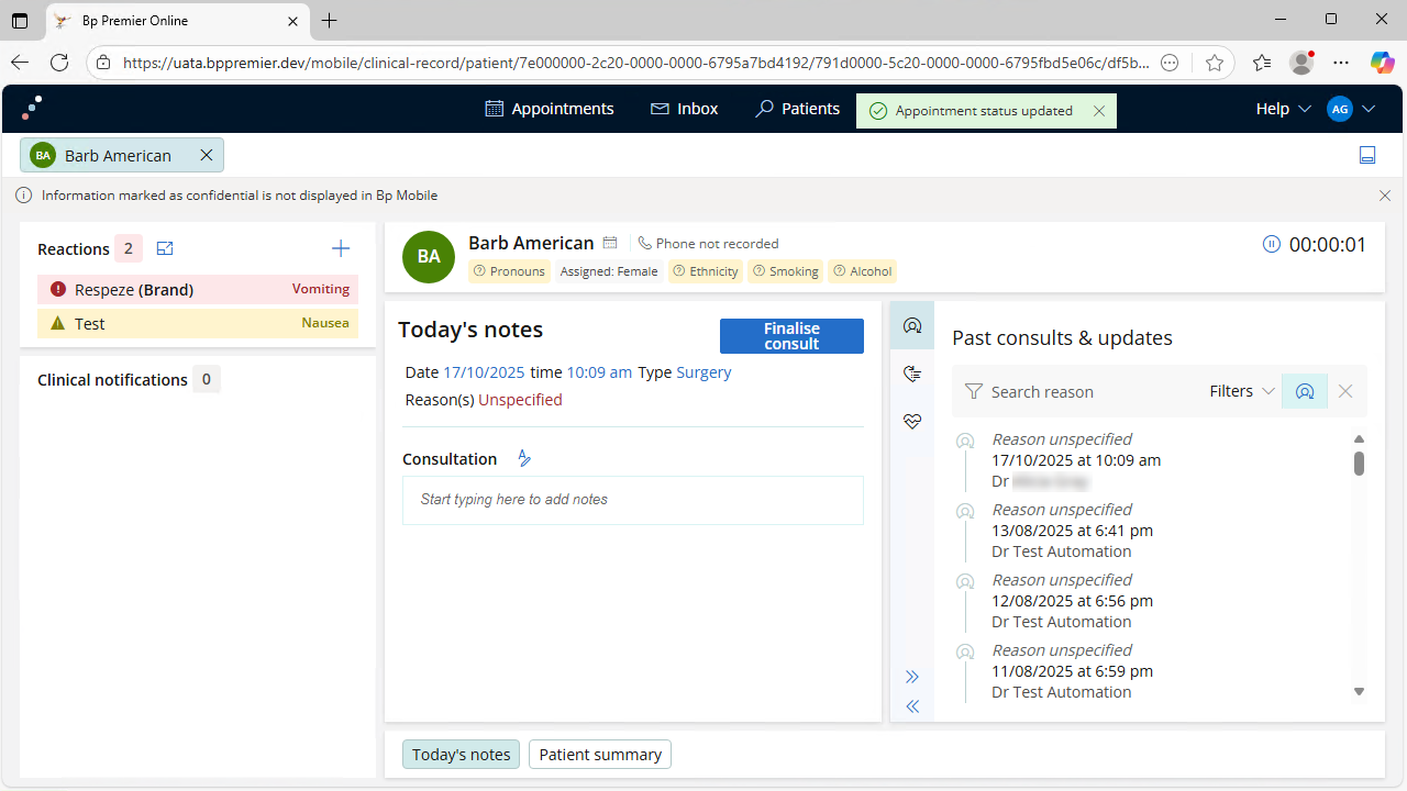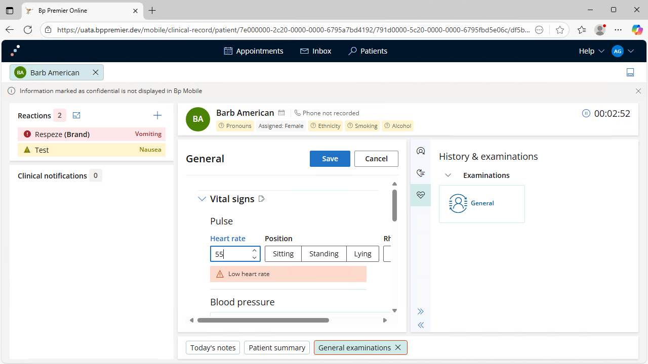 Carry out consultations remotely and update the patient record with the Bp Mobile web app. Information edited in the Bp Mobile web app will update automatically in your Bp Premier database.