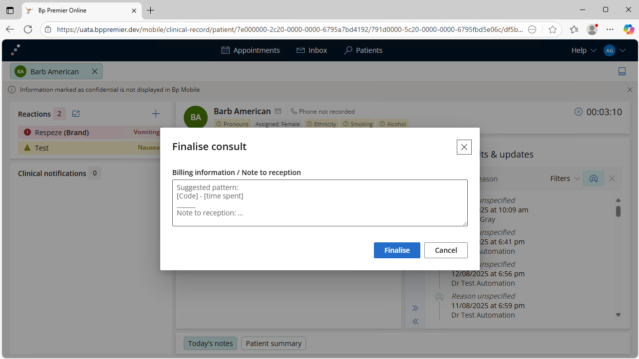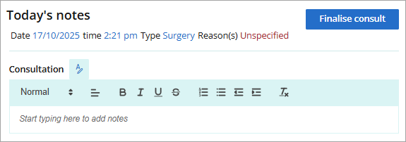 Click the Finalise consult button from Today's notes to end the consultation and add Billing information or a Note to reception if required. Click Finalise to move the appointment to At billing status.