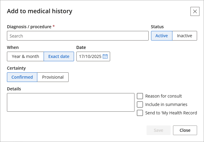 Click the plus (+) icon to open the Add to medical history screen.