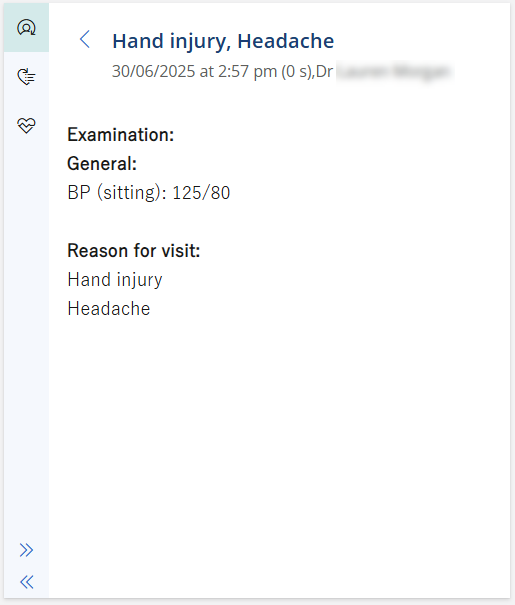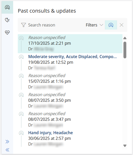 From the Past consults & updates tab in the patient tree, click on a consultation to view the clinical notes.