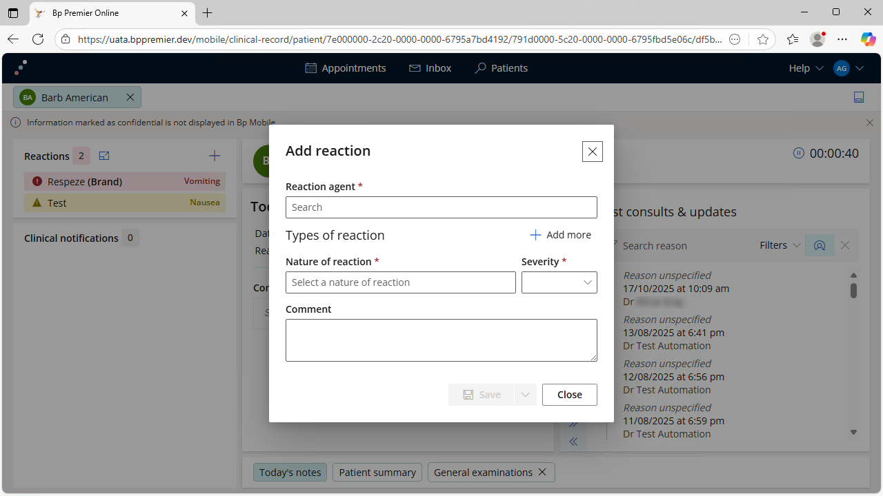 Clinical notifications can be seen below Reactions. Clinical notifications cannot be actioned from Bp Mobile.