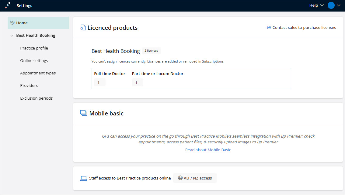 - View purchased Best Health licences, with a quick contact link to the sales team to manage subscriptions.