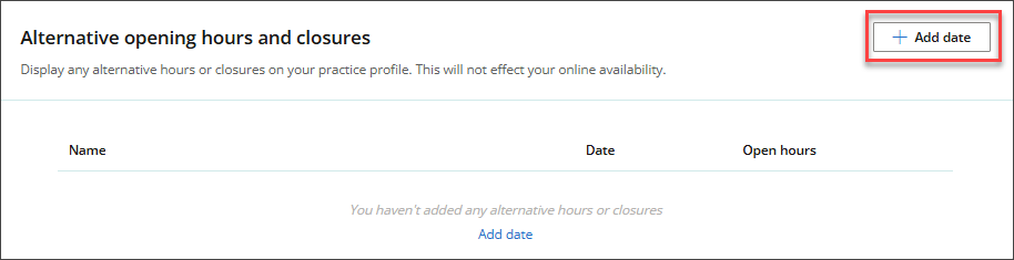 - In Alternative Hours and Closures, you can display any alternative hours or closures. Adding alternative hours and closures will not affect your online availability.