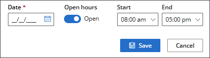 - If the practice will be closed, set the Open hours switch to Closed. If the practice is open, set the Open Hours switch to Open and enter the Start and End times.