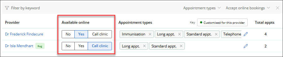 - In Available Online, select Yes, No, or Call Clinic to determine whether the appointment types for the provider can be booked online, requires the patient to call the Clinic, or is not available online.