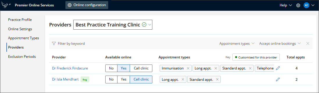 The Providers screen is used to manage provider availability for Online Bookings and configure the Appointment Types available for each provider.