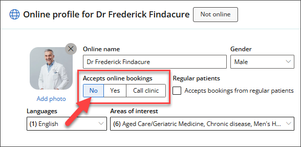 If the provider chooses not to accept online bookings, set Accepts Online Bookings to 'No'. The provider will not be included in the list of available providers for patients making online bookings.