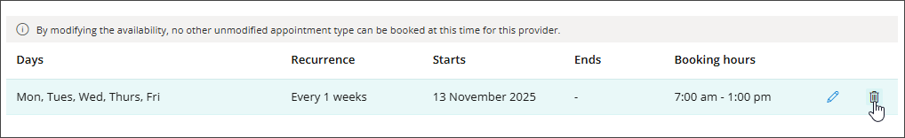 IMPORTANT By modifying the availability, no other unmodified appointment type can be booked at this time for this provider.