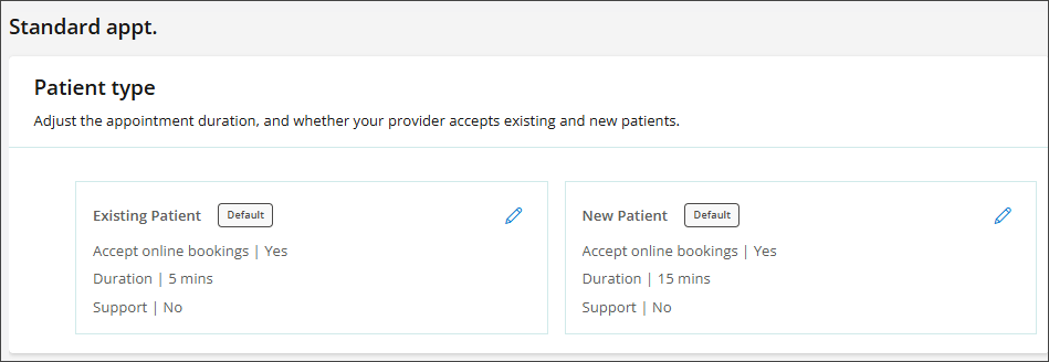 - In Patient type, you can adjust the appointment duration and specify whether your provider accepts existing or new patients.