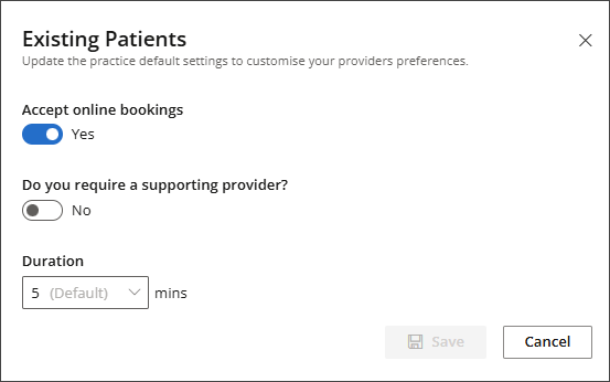 - To Accept online bookings for Existing Patients or New Patients, slide the switch to Yes and enter the appointment Duration.