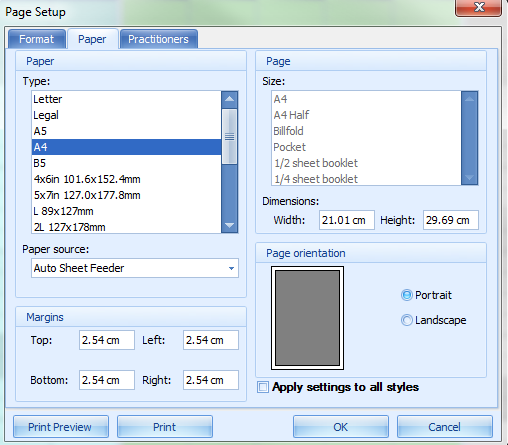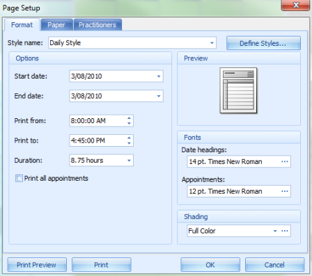 The Page Setup option from the Appointments menu changes the way your appointment book calendar will print. You can edit the calendar period, default fonts, paper size and tray, and the practitioners to include.