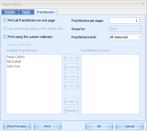 The Practitioners tab is used to select which Practitioner Calendars you wish to print out.