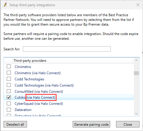 Currently, most partners will have two entries in the Setup third-party integrations window from within Bp Premier.