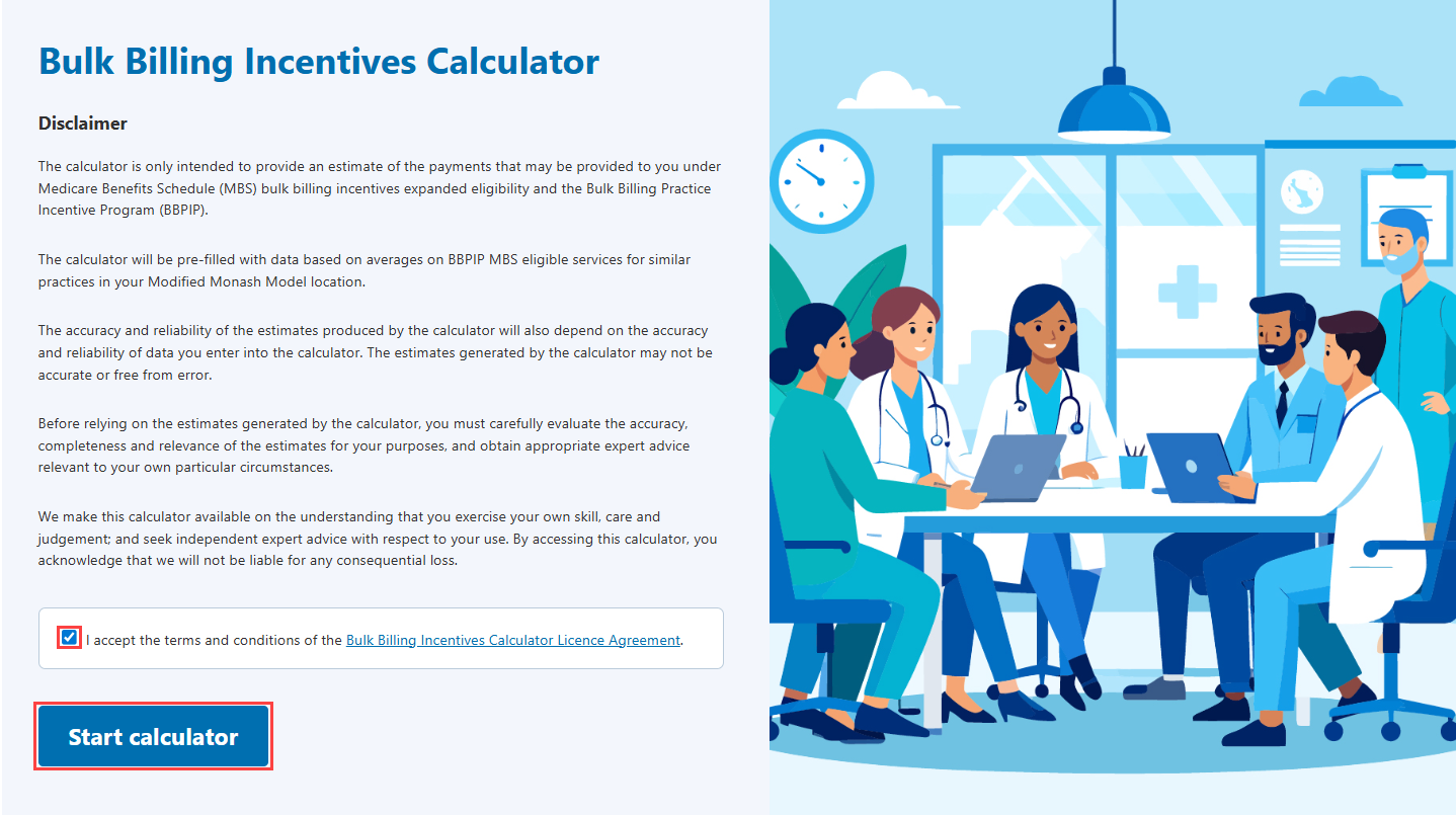 From the health.gov.au/BBPIP page on the DOHDA website, select the Bulk Billing Incentives Calculator.