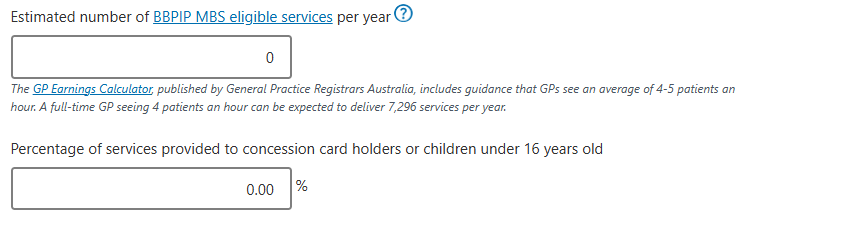 Enter the estimated number of BBPIP MBS eligible services per year and the percentage of services provided to concession card holders or children under 16 years old