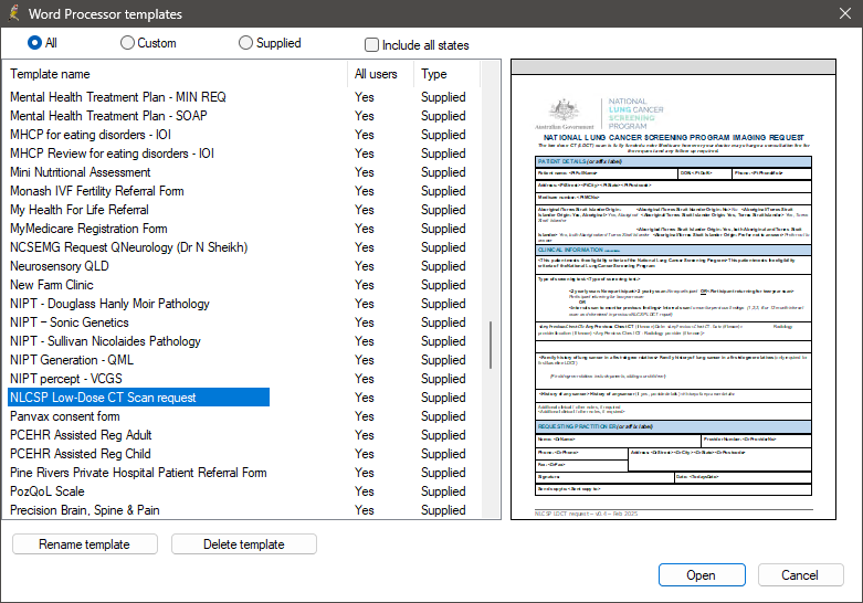 Due to additional criteria required for these imaging requests, it is not currently possible to generate the NLCSP Low-Dose CT scan requests using the regular imaging eOrdering workflow in Bp Premier. Practices must use a dedicated Word Processor template to submit NLCSP Low-Dose CT Scan requests. The NLCSP request form has been included as a Word Processor template in Bp Premier.