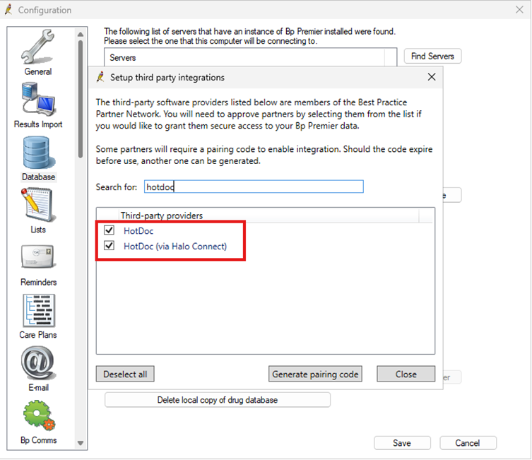 Currently, most partners will have two entries in the Setup third-party integrations window from within Bp Premier.