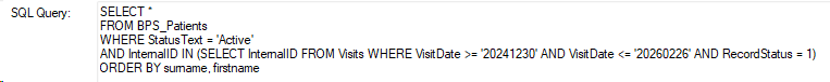 - Run the query for a result of all active patients who have visited during the specified time period.