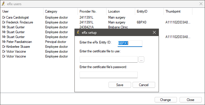 i. Select the prescriber's name in the list and click Change. A second eRx setup screen will appear.