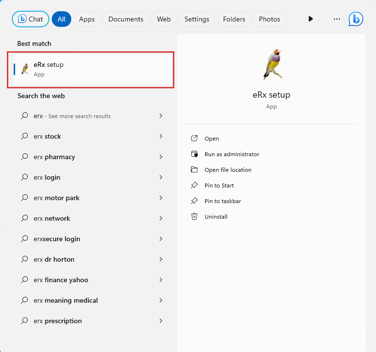 - Type ‘eRx Setup’ into the Search bar and select eRx Setup from the list. The eRx Setup utility will launch.