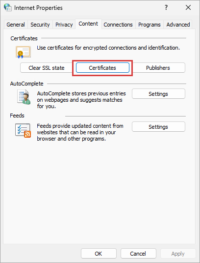 - In the Internet Properties screen, select the Content tab. Click Certificates. The Certificates screen will appear.