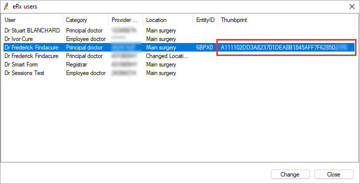 - After updating the prescriber's certificates, verify that the Thumbprint displayed in the Thumbprint column is the same for all prescribers. eRx Script Exchange may cease to function if the Thumbprint does not match.