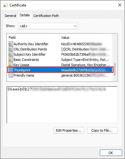 - You may have multiple certificates like this; check each certificate to locate the thumbprint. Double-click on a certificate or click View with a certificate highlighted, then select the Details tab. Scroll down to find the Thumbprint field.