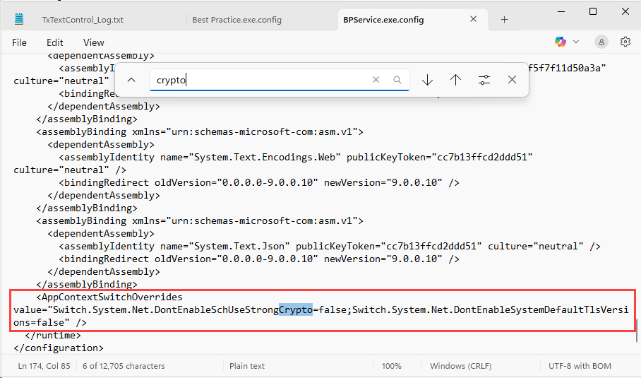 If the <AppContextSwitchOverrides /> line containing <Crypto=false;> exists, the PRODA TLS Security utility has been run successfully.