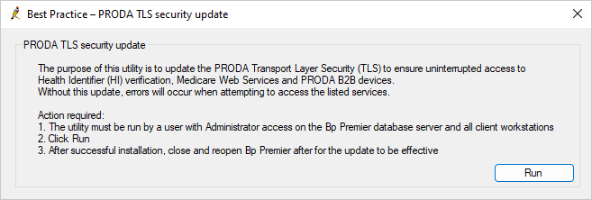 - Close Bp Premier before running the PRODA Transport Layer Security (TLS) security update utility.