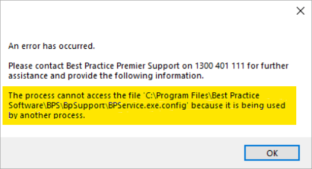 An error has occurred. Please contact Best Practice Premier Support on 1300 401 111 for further assistance and provide the following information.